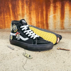 Elijah heeft een passie voor klassieke tatoeages, motoren, de retrosurfscene en mode uit de jaren 50 en 60. Dat is terug te zien in de bijzondere borduursels en graphics van de collectie, die ook knipoogt naar Elijahs iconische stijl en de skateschoen die niet weg te denken is uit de geschiedenis.